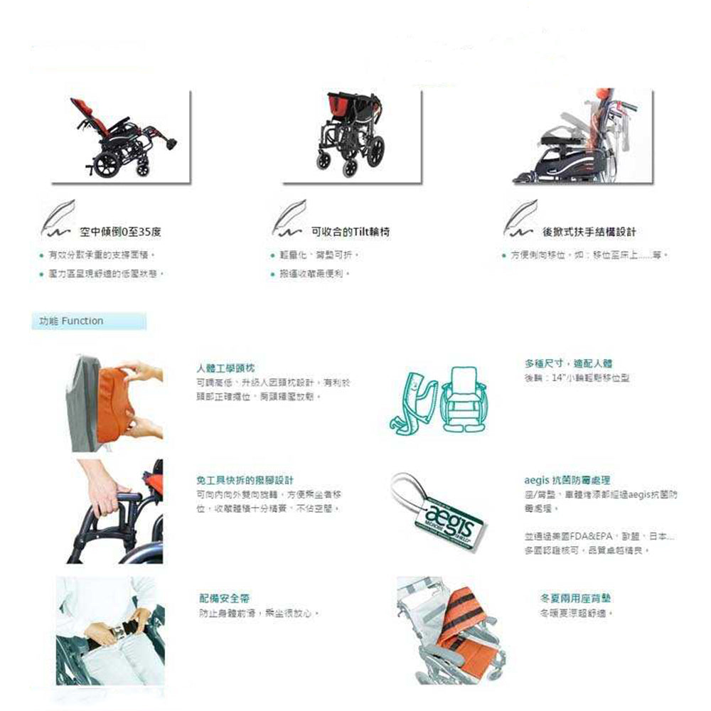 - 可躺傾、可調式背部張力背靠、骨科腳踏或可拆式腳踏、可掀起或可拆卸扶手、手柄式或腳踏式剎車系統或可摺背收藏等等。